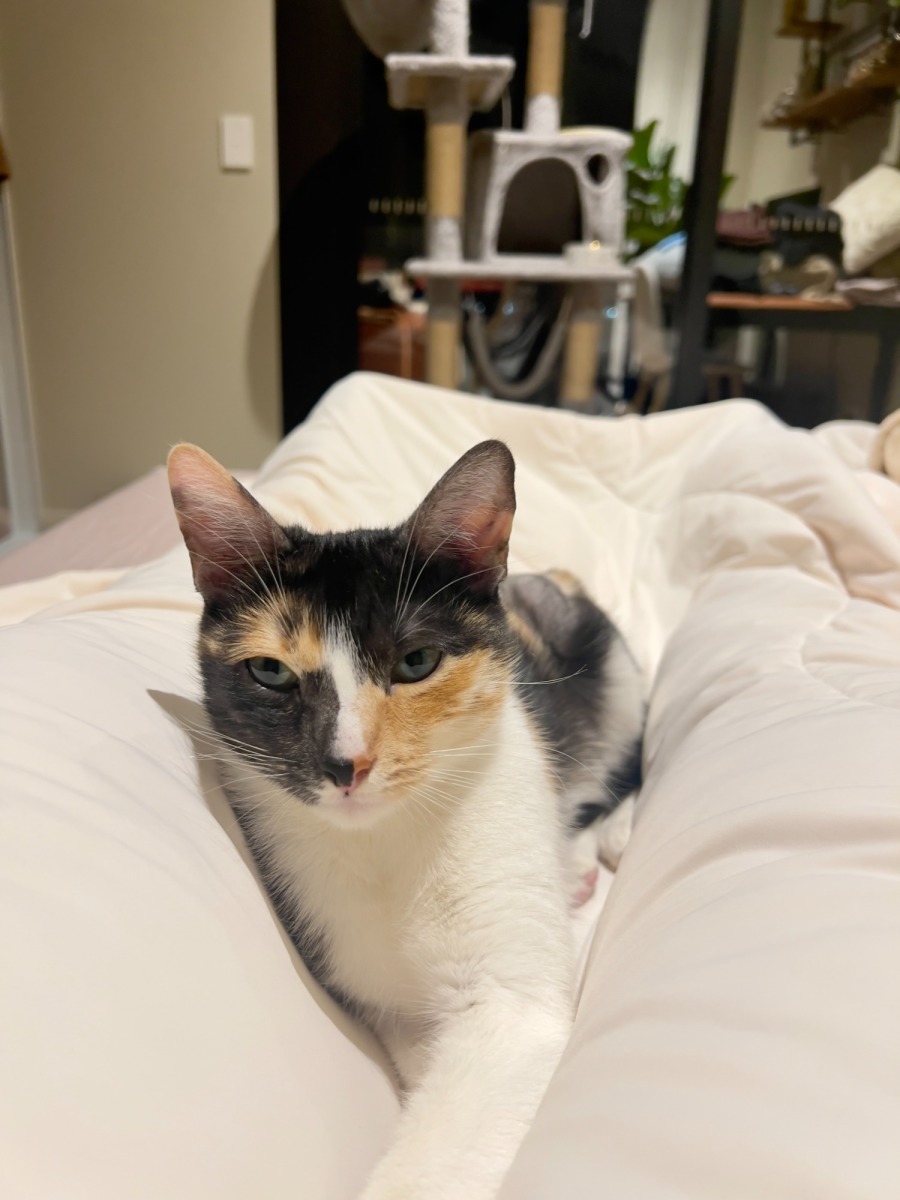 Lily loves having a quiet corner of her own as her safe space and prefers to be the only cat in the household, as she’s not a fan of sharing her humans. She’s playful with springs and feather toys and enjoys her dry food with a bit of wet food in the evenings. Lily is litter trained but occasionally might remind you to keep things tidy by peeing on clothes left on the ground! She adores her water fountain and spends most of her time perched high on her cat tree.