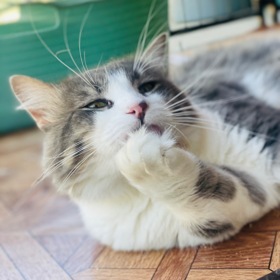 This boy is described to have a medium to long haired coat. He has beautiful pure white fur with grey patches throughout his body. And those cute little mittens are so gorgeous! This boy is certainly unique and a stunner.