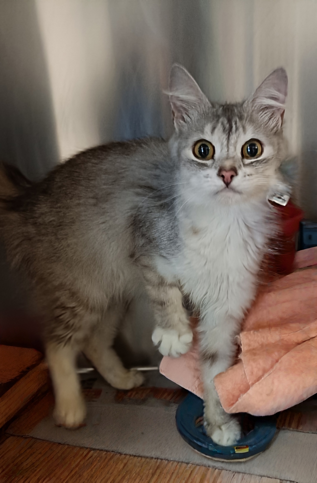This young cat is still working on her litter training, but with a little patience and guidance, she will quickly catch on. Chloe is a domestic medium hair cross Burmilla with striking features and a playful spirit. She is ready to bring joy and happiness to her new family and make a wonderful addition to any home. If you are looking for a loving and affectionate feline companion, Chloe is the perfect match for you.