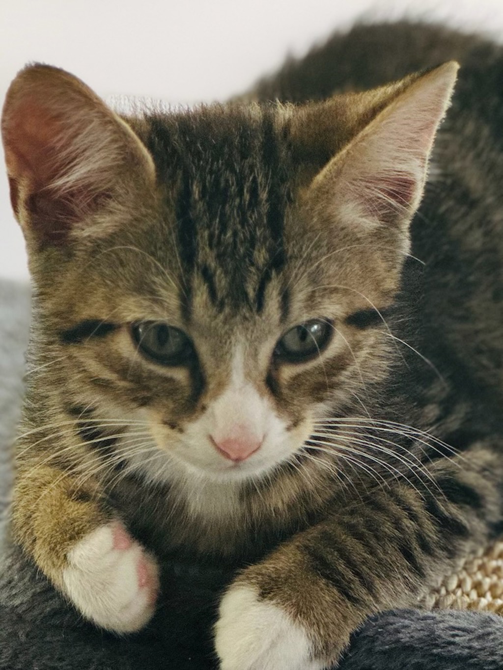 He loves chasing toys, playing with his brothers and climbing to new heights on his scratching pole. After his kitty workout he loves nothing more than snuggling up for a cozy nap on your lap with some smooches that are sure to melt your heart.
