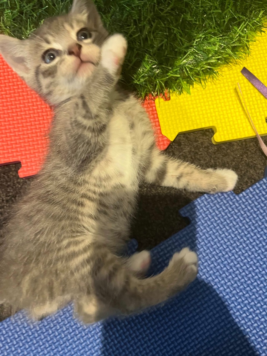 He must be adopted with one of their siblings or to a home with an existing cat. Kittens do much better with a friend and it is worth researching “solo kitten syndrome”
