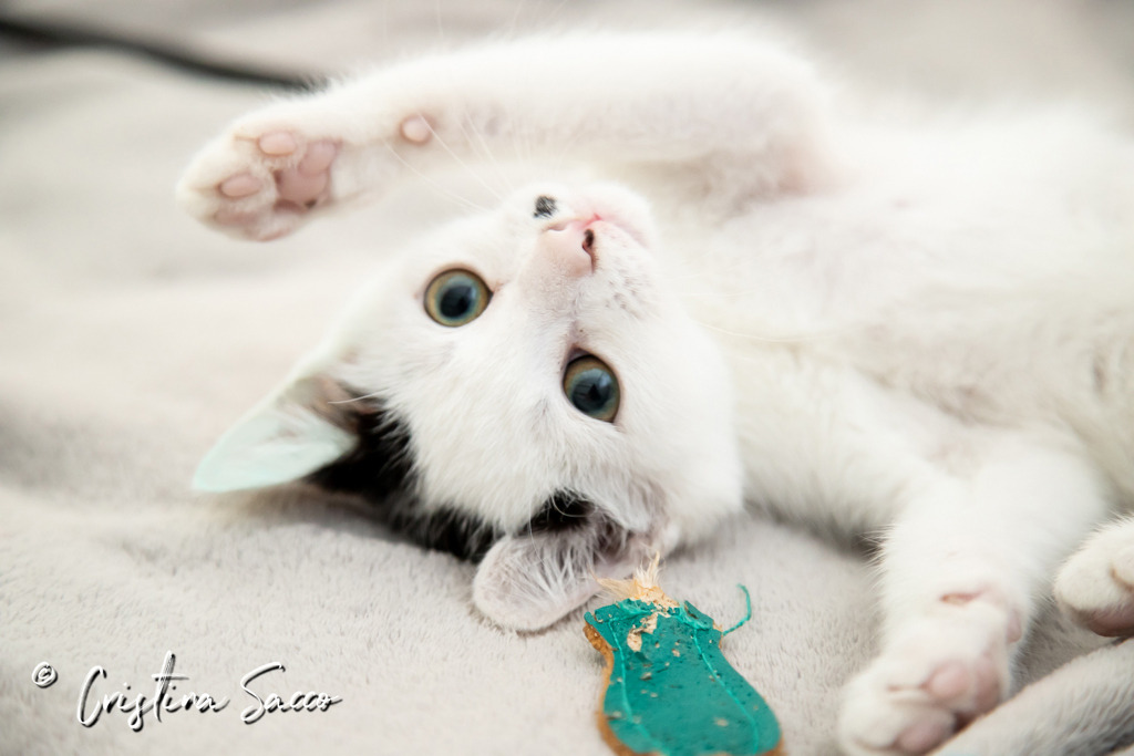 While she is a massive cuddle bug, she is also a big fan of some play time with her kitty toys or her humans. Ripley loves the wand toy with dangly things on it and a little spiral toy that she can watch bounce and then take off chasing it with great energy. Ripley is the gentle sibling in the play wrestles and is ever so gentle with her humans.