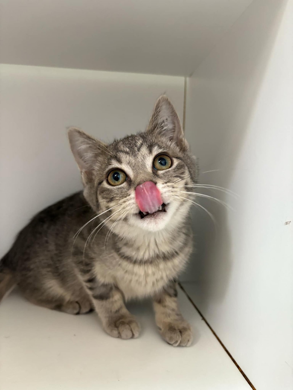 Meet Cyclone, the sweet, soft grey tabby kitten who is looking for a family to call his own! Cyclone might be a little shy at first, but once he gets to know you, you'll experience the full power of his love. Despite his rough start as a stray, he's blossomed into a lovable and playful kitten who enjoys frolicking with his littermates and exploring the world around him.