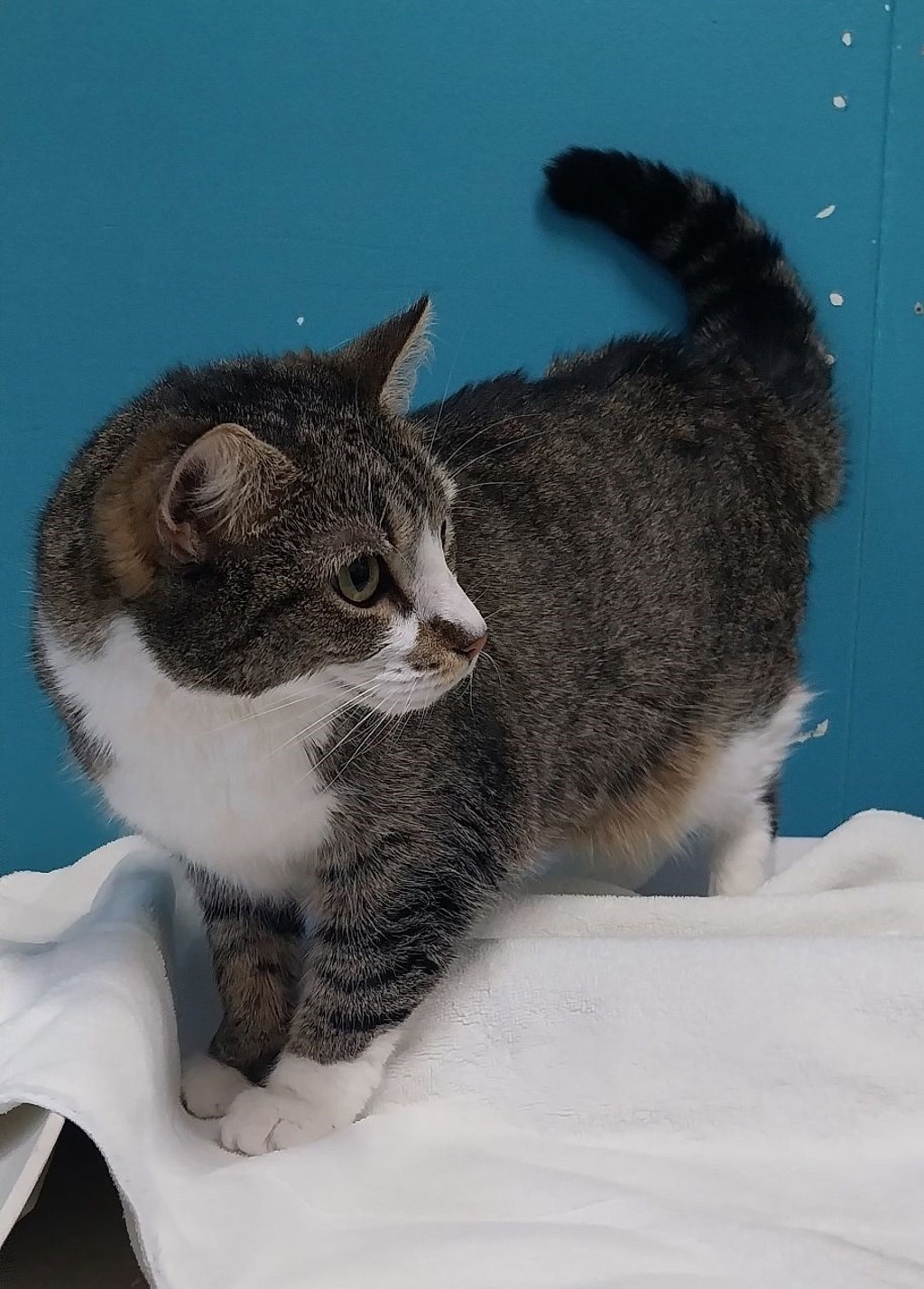 Ola, I'm Boots, a stunning and confident tabby and white female domestic shorthair cat, who is ready to find her forever home!