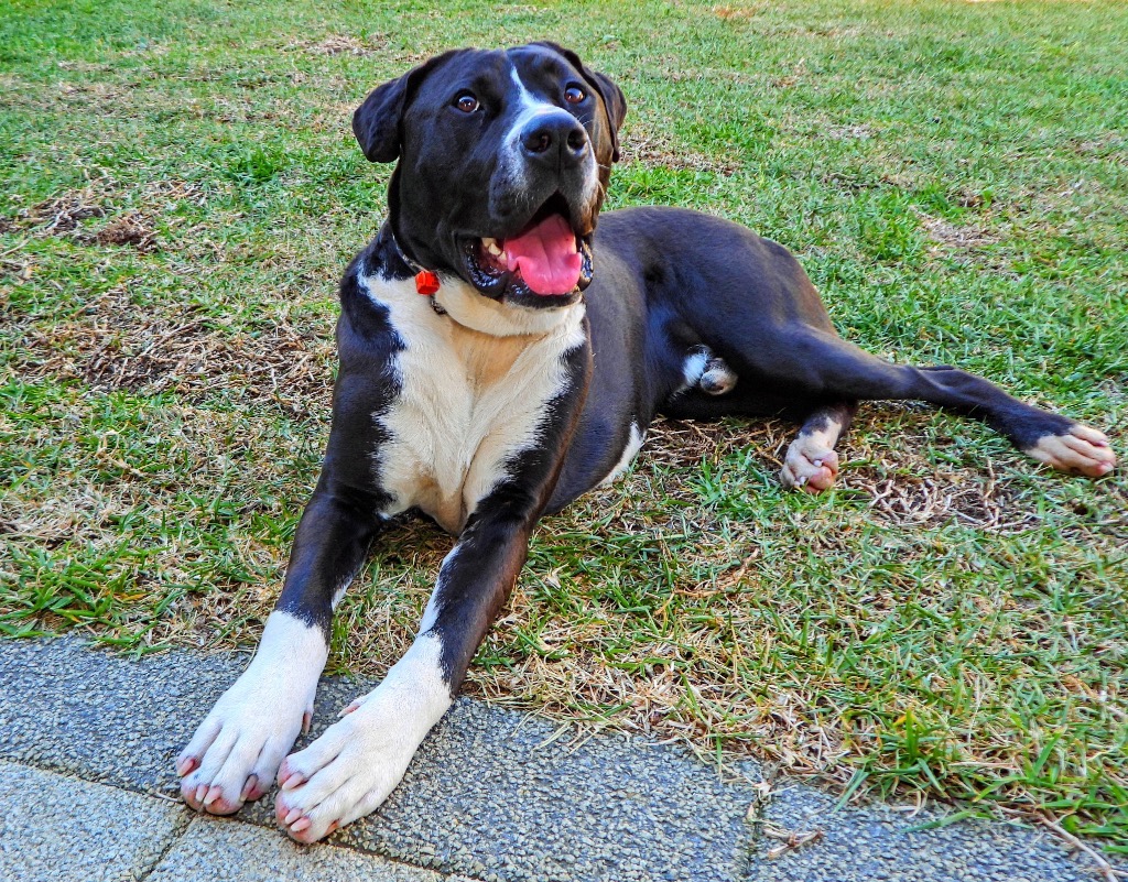 Meet Austin! This loving, 'gentle giant' is a true gentleman. He's a joy to walk (really good on lead), and enjoys meeting people and dogs when out and about. You can even relax at a cafe with this big boy. He loves playing tug of war and fetch, and although is used to being alone all day at his foster carer, would enjoy an active family with another dog at home. And so well toilet trained he even squeezes himself through a dog door intended for a much smaller dog! He needs some training, but will be a loving, affectionate goofball who just wants cuddles on the couch.