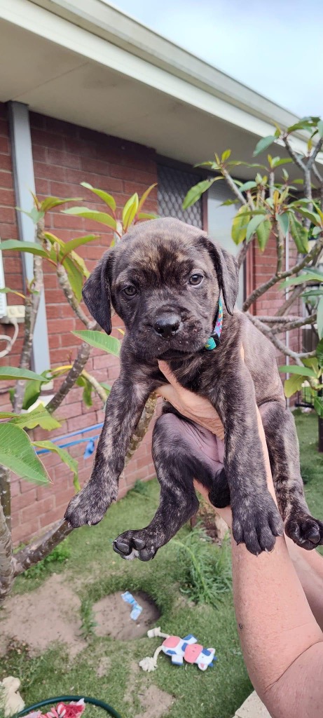 With Mum being a Dogue de Bordeaux and Dad a Cane Corso, this pup is a mix of two magnificent Mastiff breeds and will grow into a large-sized dog.