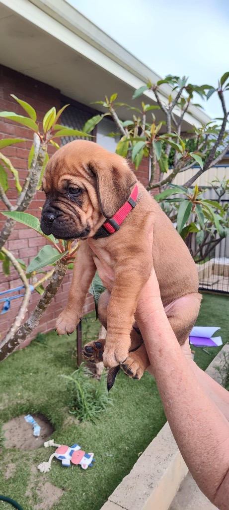 With Mum being a Dogue de Bordeaux and Dad a Cane Corso, this pup is a mix of two magnificent Mastiff breeds and will grow into a large-sized dog.
