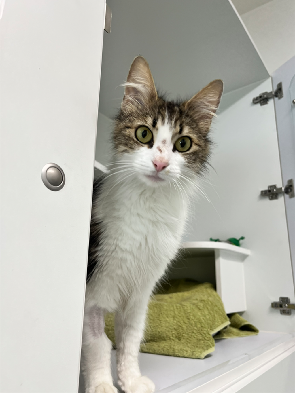 This sweet girl is fully litter trained and prefers to be an indoor kitty. If you're looking for a loyal and slightly quirky feline friend, Alyce is the perfect match.