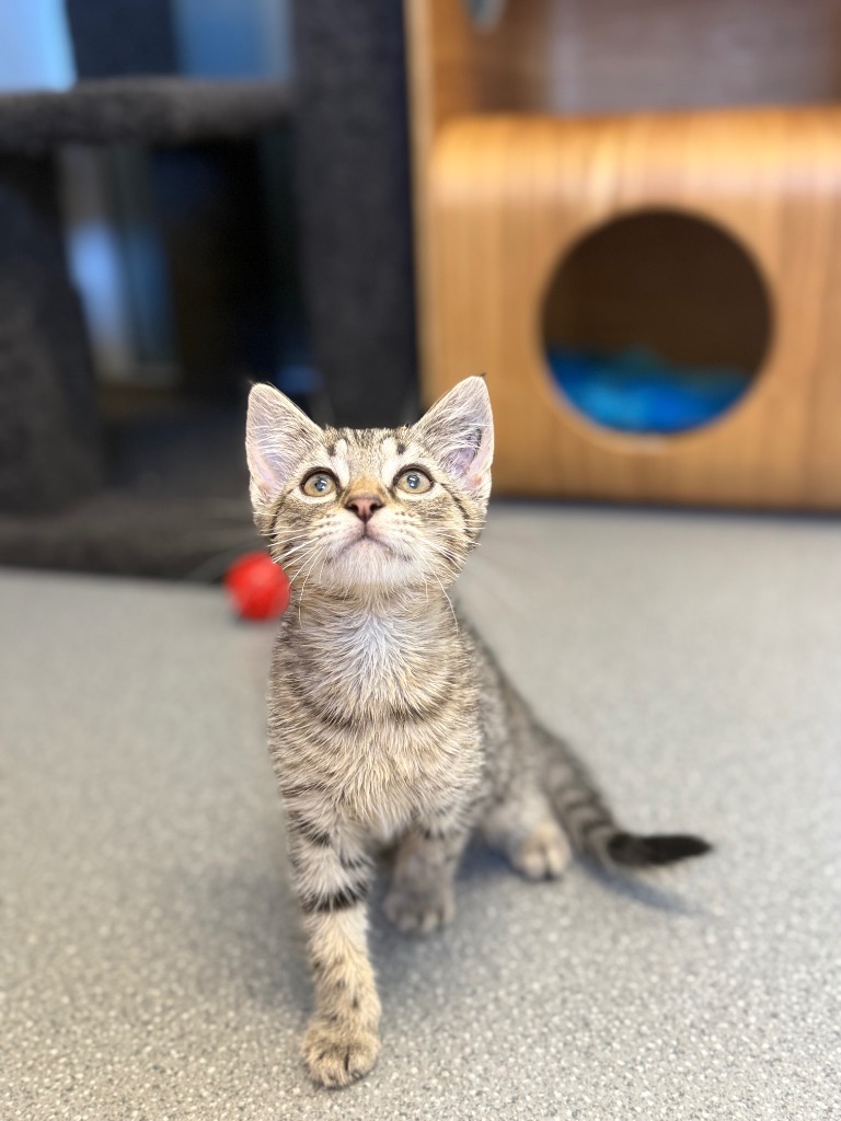 Meeny was born in our care after her mum arrived as a stray, her mum was reclaimed and now Meeny and her siblings are eager to find their forever homes. Meeny enjoys pats and will always give plenty of kisses and gently touching her nose to yours. Meeny is on the calmer side compared to her littermates but she still enjoys a good amount of play time. While in foster care, Meeny has been around a small dog and other cats but is untested around kids. If you would like to meet Miss Meeny, you can visit her at our Longford Adoption Centre.