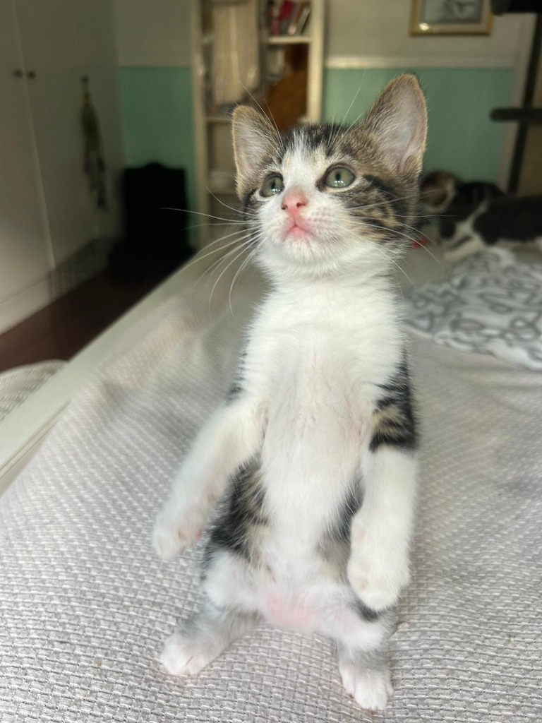 Astro is the astronaut of the bunch, always shooting for the stars (or at least the top of the cat tree). A playful yet affectionate kitten, Astro adores interactive toys and is often found gazing out the window, as if pondering the mysteries of the universe.