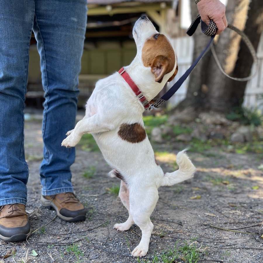 He's had basic training, making him a well-rounded addition to any home. Equipped with good lead manners, he may show a little enthusiasm at first by pulling, but will quickly settle into a rhythm and walk on a loose lead. True to his Jack Russell nature, he's endlessly curious, and his keen sense of smell makes every walk a delightful sniff-fest.