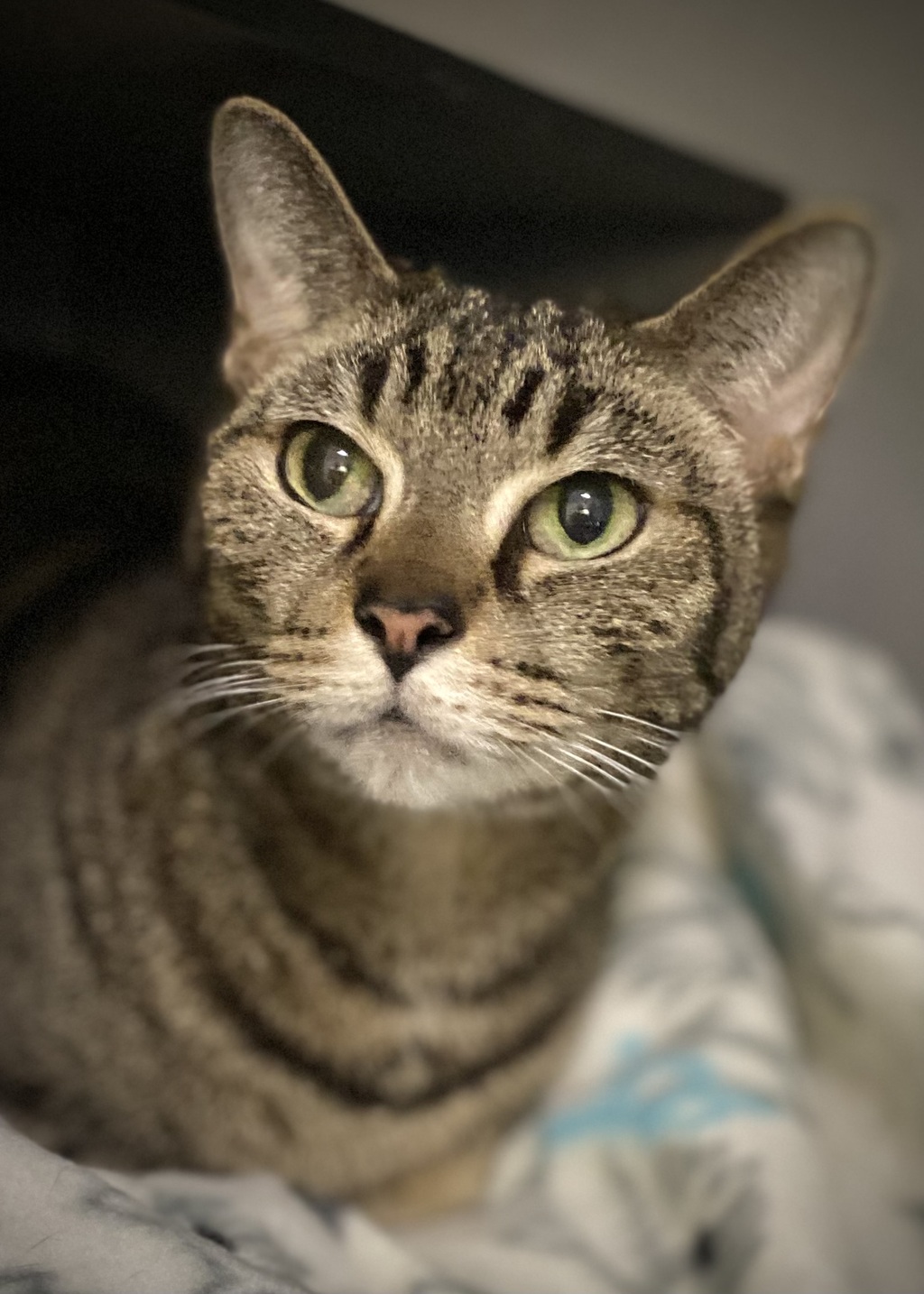 Surrendered due to no fault of her own, Izzy loves sleeping with her people and enjoys gentle attention once she feels safe. She's a fan of wet food treats and will appreciate a calm, loving home to call her own.