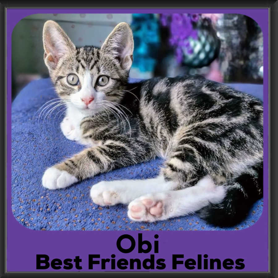 Hi, my name is Obi, and yes, the force is strong with this one. This beautiful tabby boy just loves to give you cuddles and fall asleep on you in various ways.