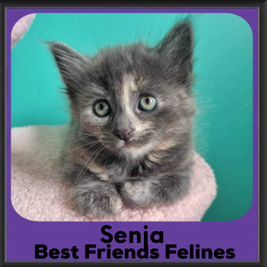Senja is a gorgeous grey calico with a little bit of fluffy fur making her extra soft and cuddly. She’s one of the more confident of her sisters and was the first to explore when let out of the kitten room to explore the house. She’s loved playing with new toys, new space to zoom about, and tackle sisters, and even worked up the courage to say hi to some of the bigger kitties. Between play time and nap time, Senja loves a little cuddle, and She’d love to say hi to her new family, could it be you?