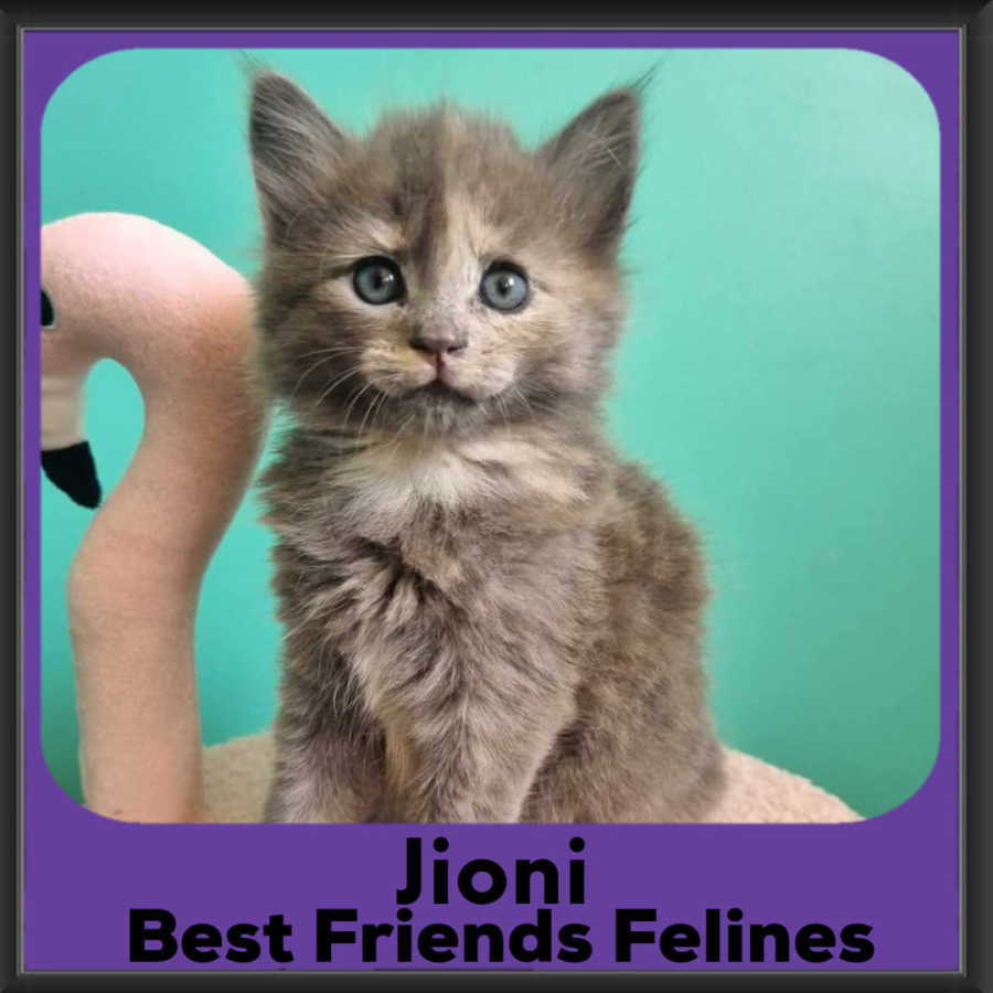 Jioni is a bit of a stand out in her litter, all of them grey calico sisters, with her super soft floof she’s extra snuggly! Jioni loves her cuddles and is one of the more confident of her litter, so is always happy to come up to say hi and ask for a snuggle. Jioni was quick to say hi to the bigger kitties in the house, but still prefers to play, rumbling and tumbling, pouncing and bouncing with her sisters and their toys.