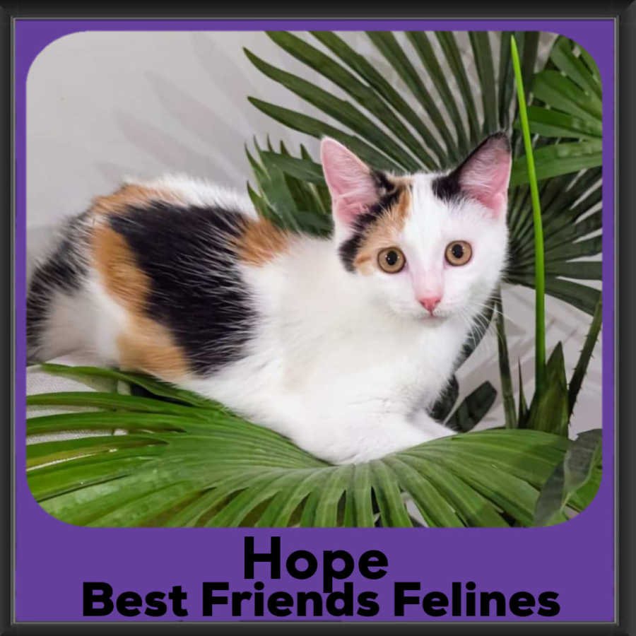Hope is super sweet, gentle and playful. This beautiful little calico has the tiniest voice. She loves to play, and spends her day making biscuits and looking over her two siblings. Initially a little reserved when she meets you, she very quickly warms up and will pounce her way into your heart.