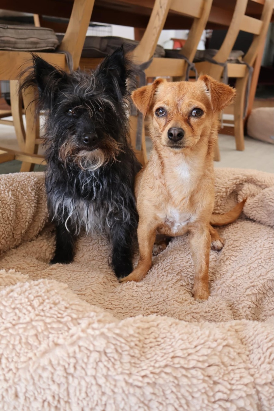 Vogue (small tan dog in photos) came into care with her mother (the scruffy terrier type in the photos) and before coming into care had not had the best exposure or experiences with people. It takes her a little wile to trust but as soon as she does, Vogue is a shadow and will be your loving and loyal companion, always by your side. She is super cuddly and would like nothing more than to snuggle up under the doona with you in the bed or on the couch with you. Vogue is not confident with being picked up in the beginning and has gained confidence in her foster home as she has been allowed to try and do everything by herself. She will even hop into a carry bag by herself which makes it easy to take her out and about with you!