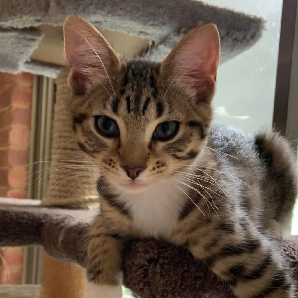 Karrie is a beautiful kitty with distinctive markings like a mini leopard. Karrie loves being petted. She is quite the independent little lady: she will happily play on her own (however is just as content to join in playing with her siblings). She has great fun with toy balls, feathers and tunnels.