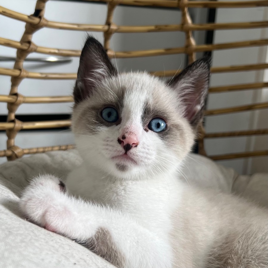 Meet Possum, a 9-week-old Siamese and Domestic Short Hair mix (Snowshoe) who captivates everyone with his stunning blue eyes and charmingly intricate markings. This little chatterbox is always ready for a friendly conversation, bringing joy to his human family and their feline friends. He's always happy to accept pats and love from his people and curious to know when his next meal is being served!