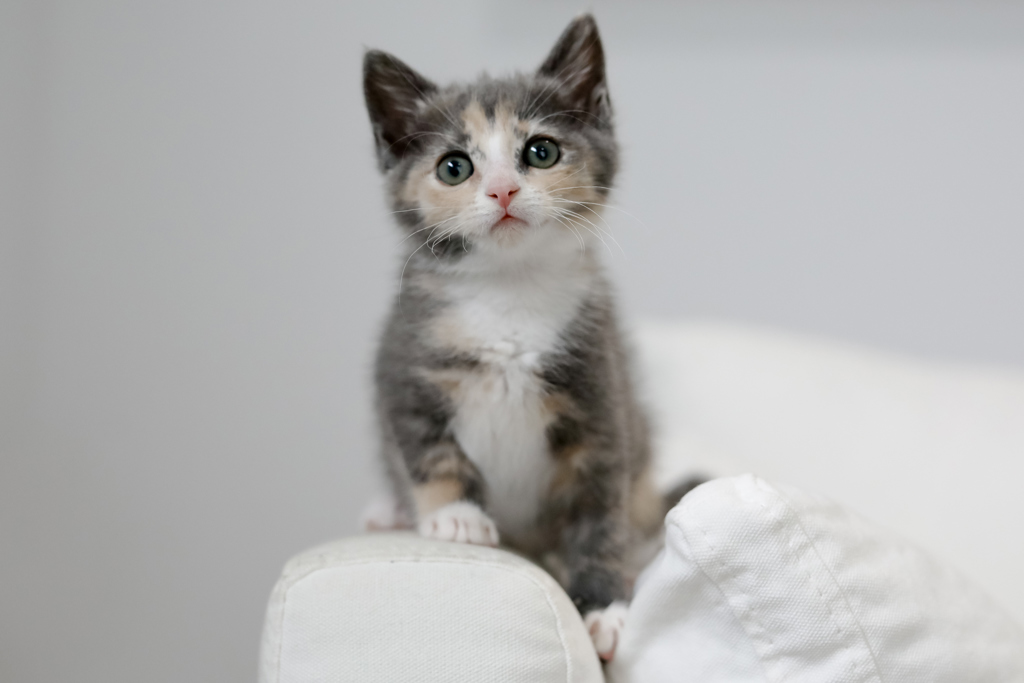 Prim is all about fun and mischief. She loves to play, whether it be chasing dangly toys, the laser pointer dot, or even her human's wiggly toes! But don't worry - she is a very gentle kitten and would never hurt you. When the playing is done, Prim likes to relax on top of her scratching pole, napping in the warm sun and watching the world go by out the window.