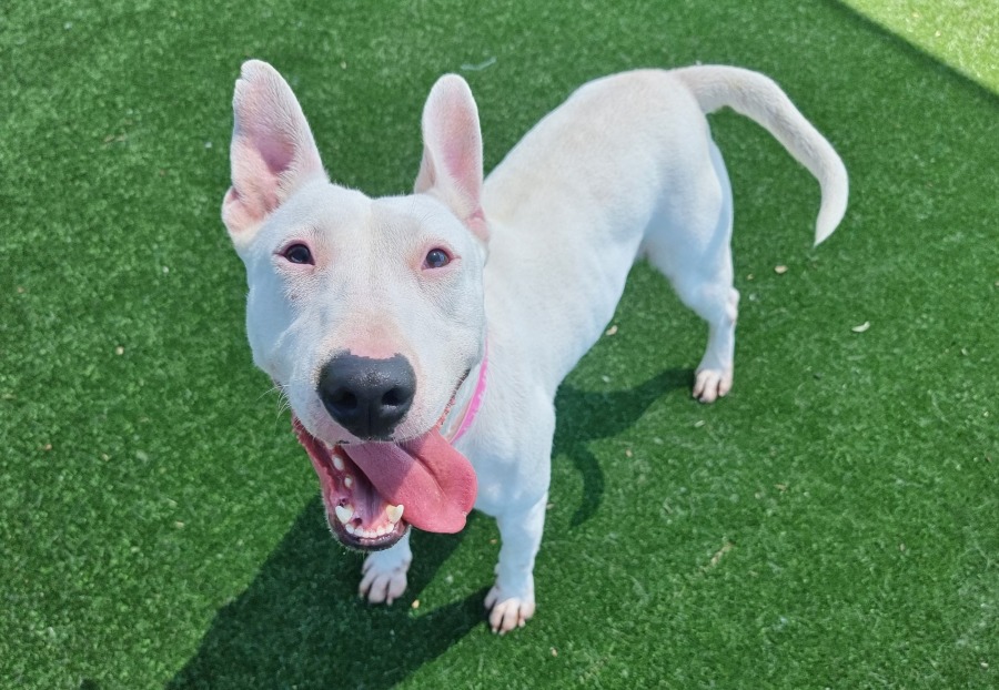 What makes Pebbles especially wonderful is her ability to enjoy her own space and downtime, making her an ideal companion for a family with kids who can match her lively spirit. While Pebbles thrives on human companionship, she's best suited for a household where she'll be the only dog, as she has no previous experience with other dogs and fixates from a far.