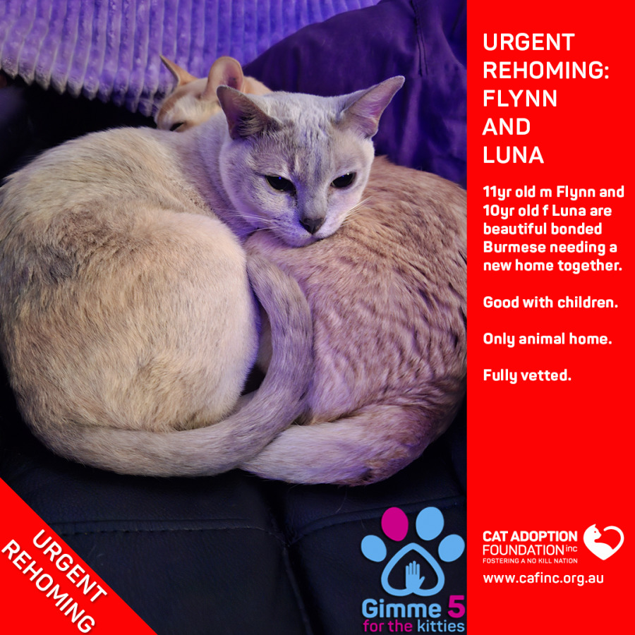 Donate to Flynn & Luna Private Rehoming No Charge! at Cat Adoption Foundation Incorporated via Shout