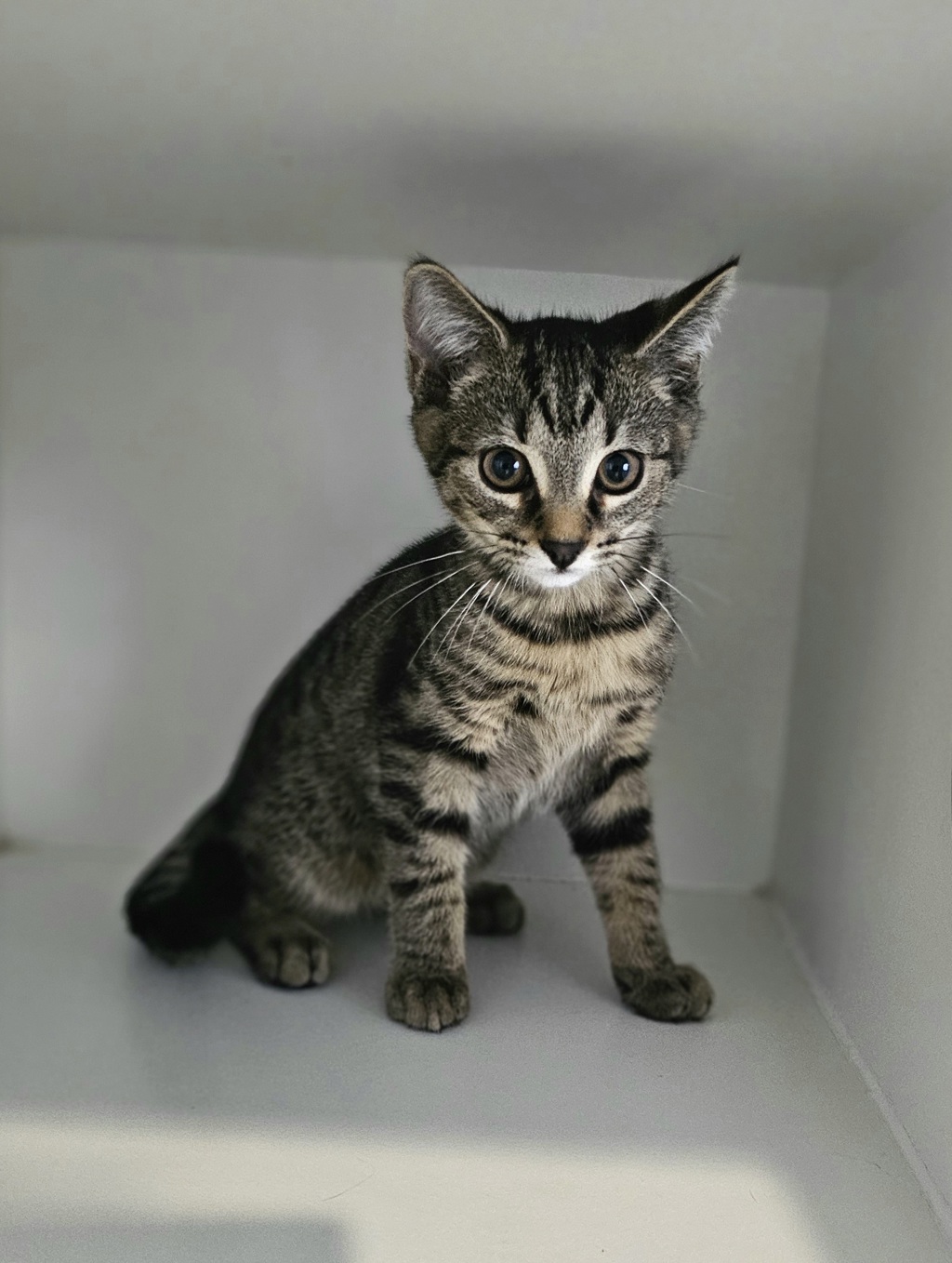 Jalapeno is an adorable 3-month-old tabby with a gentle, shy personality and a playful spirit. This sweet boy is still finding his feet in the world, so he's looking for a calm and quiet home where he can feel safe and secure. Once he gets to know you, his playful side shines through, and he'll love engaging in fun activities and exploring his new surroundings.