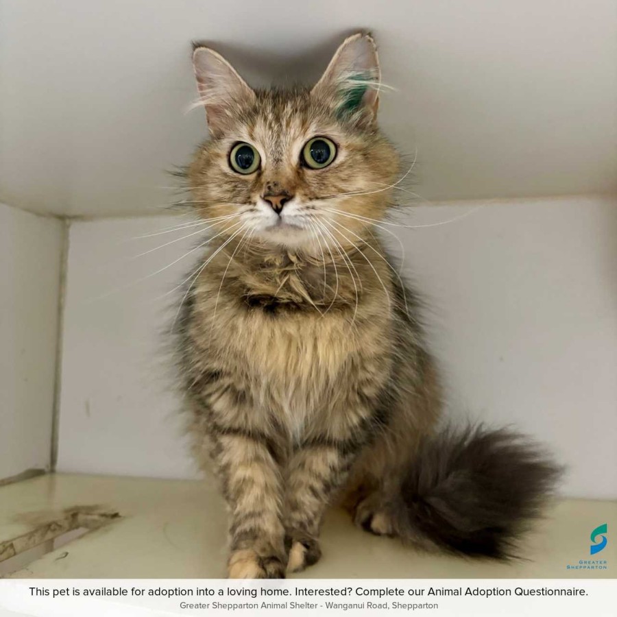 Introducing Kat, a Tabby Tortoiseshell Domestic Medium Hair with a personality as purrfect as her name! This sweet and sassy girl is ready to steal your heart and curl up next to you for endless cuddles.