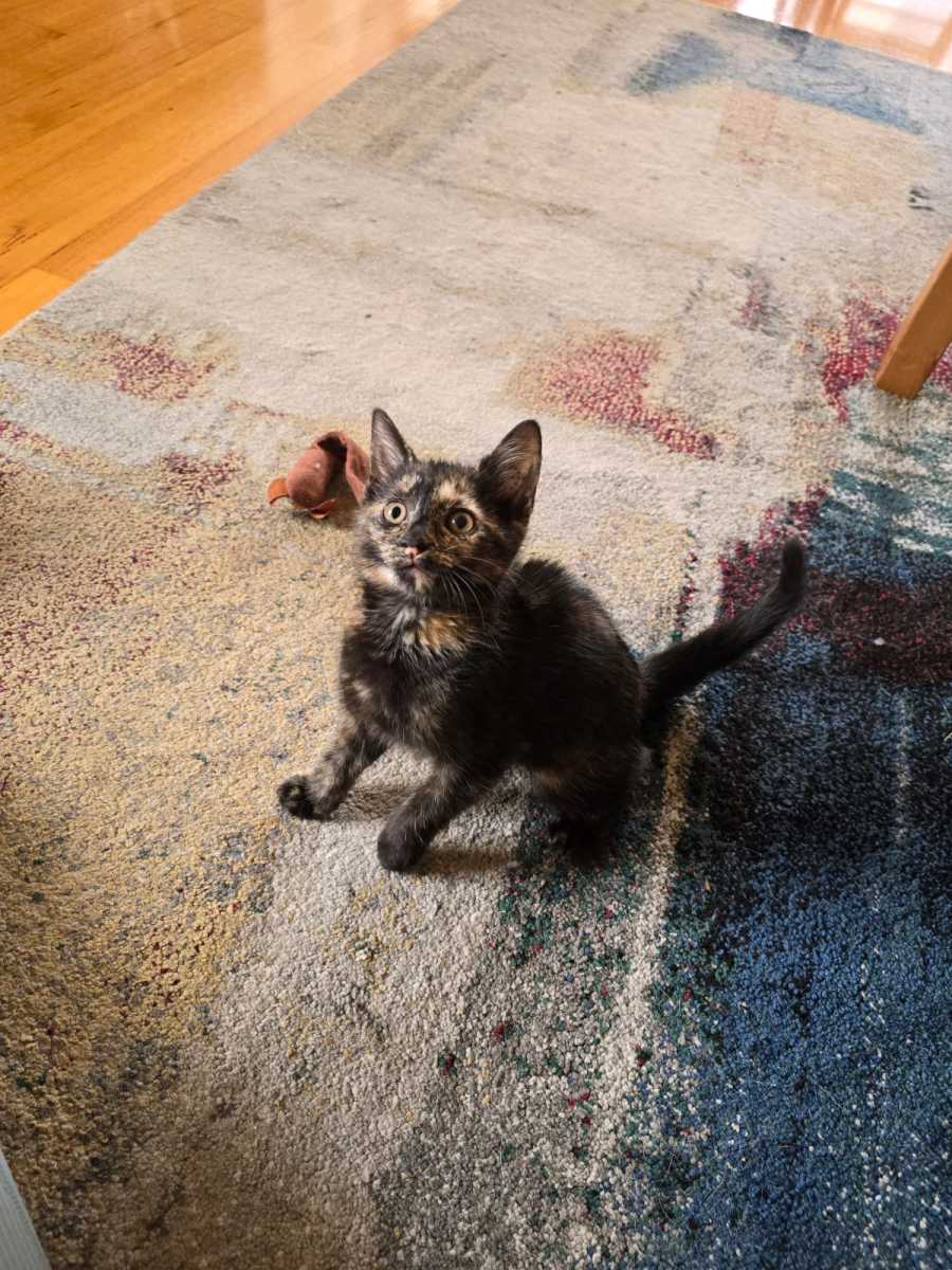 Tilly is an adorable 2-month-old kitten bursting with curiosity and energy. Her adventurous spirit shines as she explores every corner of her environment, always eager to discover new wonders. This playful bundle of joy delights in chasing after toys, transforming even the simplest of objects into her personal playground. Once she's had her fun, Tilly is more than happy to snuggle up for some love and affection, providing the perfect balance of entertainment and companionship.