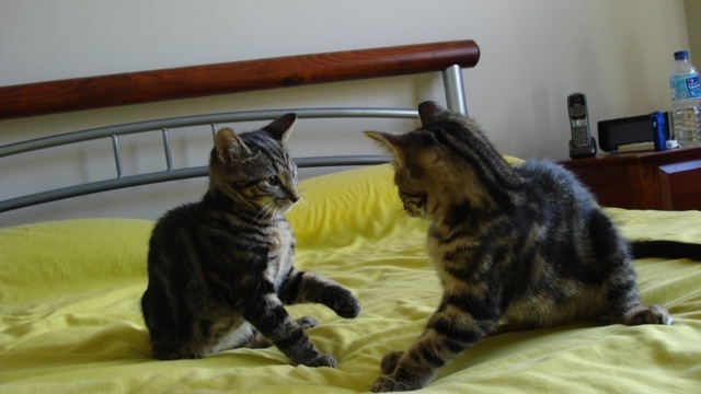 I come from a litter of four almost identical kittens. It was so hard to tell us apart that we had to have tiny dots of different coloured nail polish on our ears. Because there were 2 males and 2 females, someone had the bright idea of naming us after abba. (i think i was lucky to get benny!)