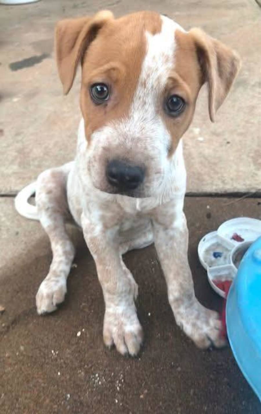 Geode has the classic markings of a red cattle dog with ginger speckling and patches and red ears.