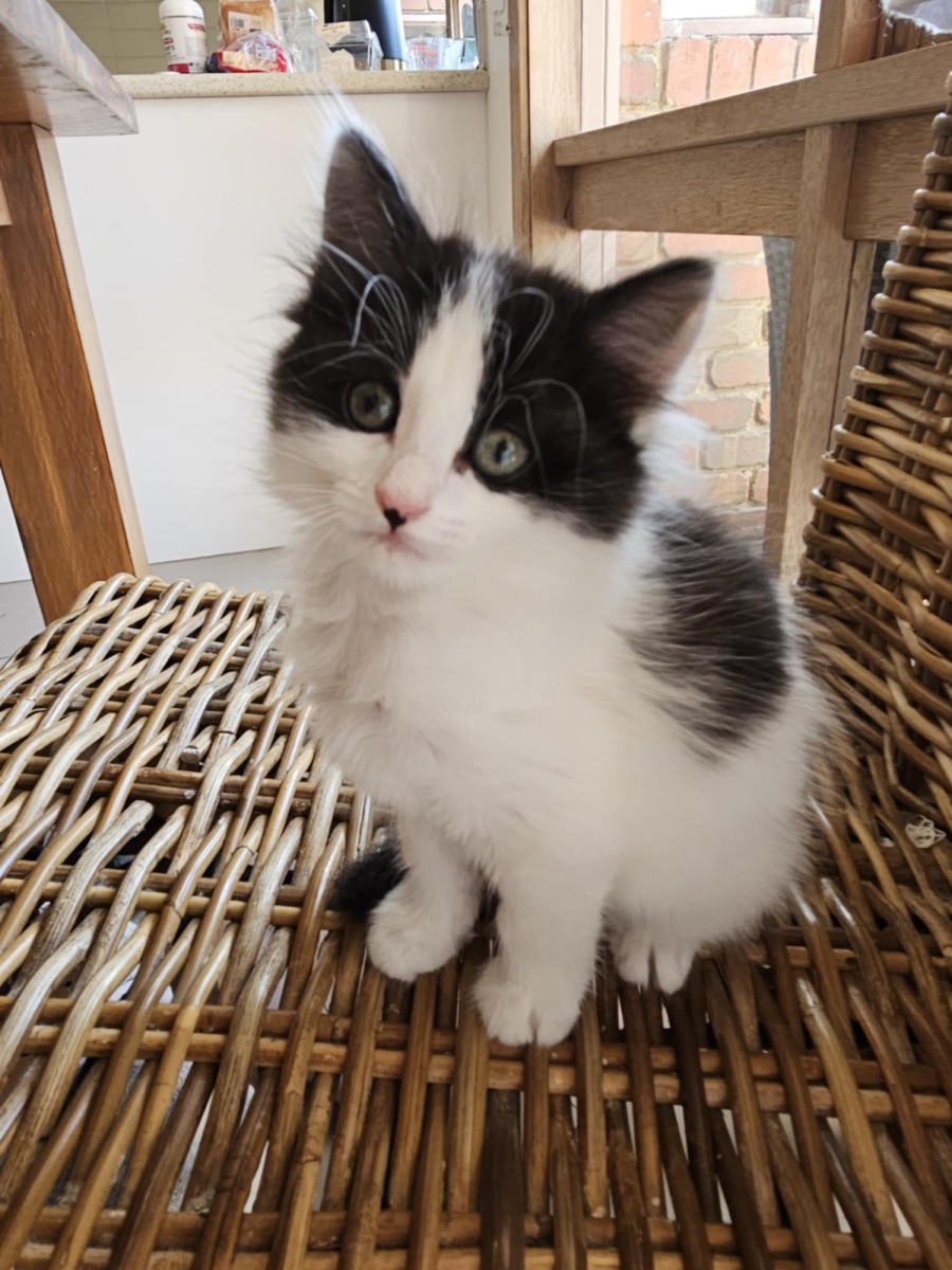 Pepper is an irresistible fluffy black and white kitten with a heart full of love and motor like purrs that start the moment you pick her up. Her affectionate nature shows as she snuggles up close to you. This little sweetheart is also full of energy and ready for an adventure around the house. She loves exploring and playing with the other cats, kids, and toys. She would love a household with a friend to play with and a home full of love.