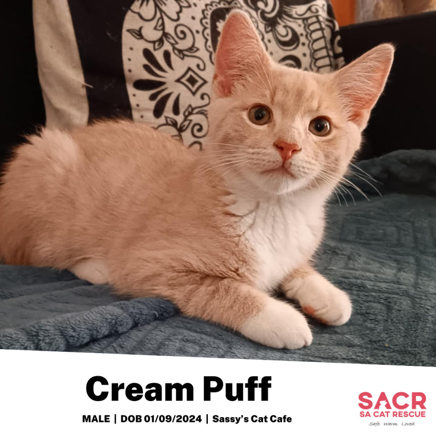 Cream Puff's adoption fee is $195 which includes desexing, microchipping, parasite prevention, and initial F3 vaccination.