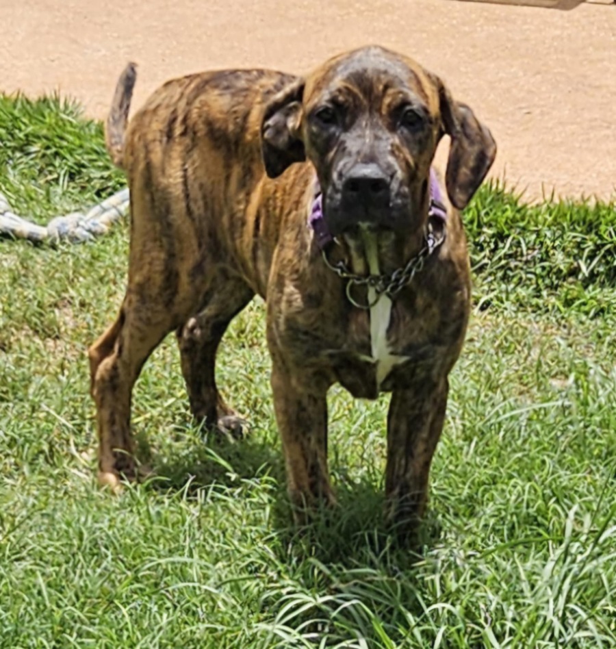 Prada is Bull Arab x Mastiff. She has a beautiful Brindle coat, a striped coat pattern that often can look similarly to a tiger.