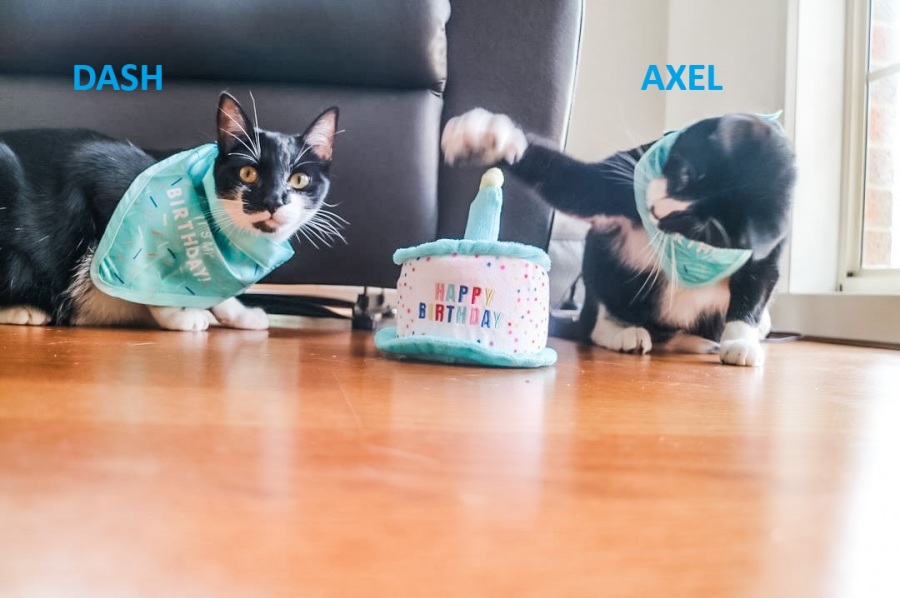 In the birthday pic of the boys, Dash is the one looking at the camera and Axel is the one bopping the cake! Pretty much sums them up, Axel is super playful and wants to always be amongst it, greeting new guests at the door and forcing his love and playfulness onto anyone he meets!