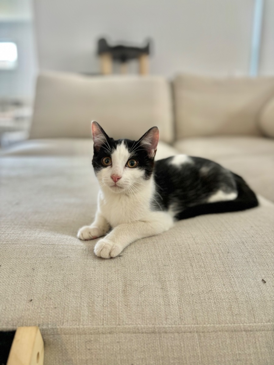 Meet Maverick, a delightful young kitten with the most captivating brown eyes you'll ever see. He's a bundle of energy, full of life and ready to bring joy to his new home. Whether he's doing zoomies around the room or leaping to catch a feather wand, Maverick's playful spirit is sure to entertain and uplift everyone around him.