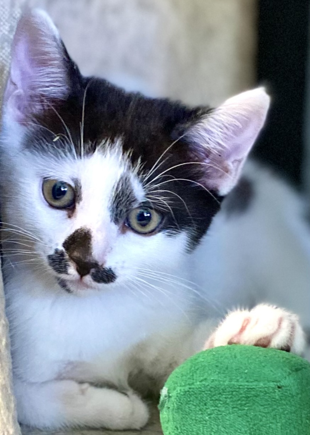 FRIENDS:- With gentle guidance, most kittens are very adaptable and we see Holly living with cat-savvy, respectable children, another cat or perhaps a dog, if Holly is helped co-habit with them. It will require patience and love from the humans to make this a successfully blended family.