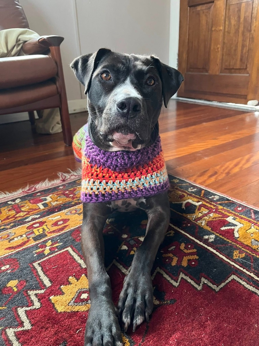 During the day, Estelle loves lounging around in the sun or her fluffy bed while her foster parents work from home. She lived with children in a previous foster home, who said she was very gentle & patient. Estelle has the funniest talking voice which she uses to tell you how excited she is for dinner or when itâs time to go âwalkiesâ.