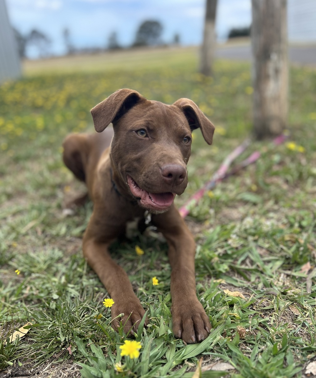 Meet Joy- Staffy X Mastiff, she has the most beautiful chocolate coat you'll ever see! This little lady has personality that will melt your heart in an instant.