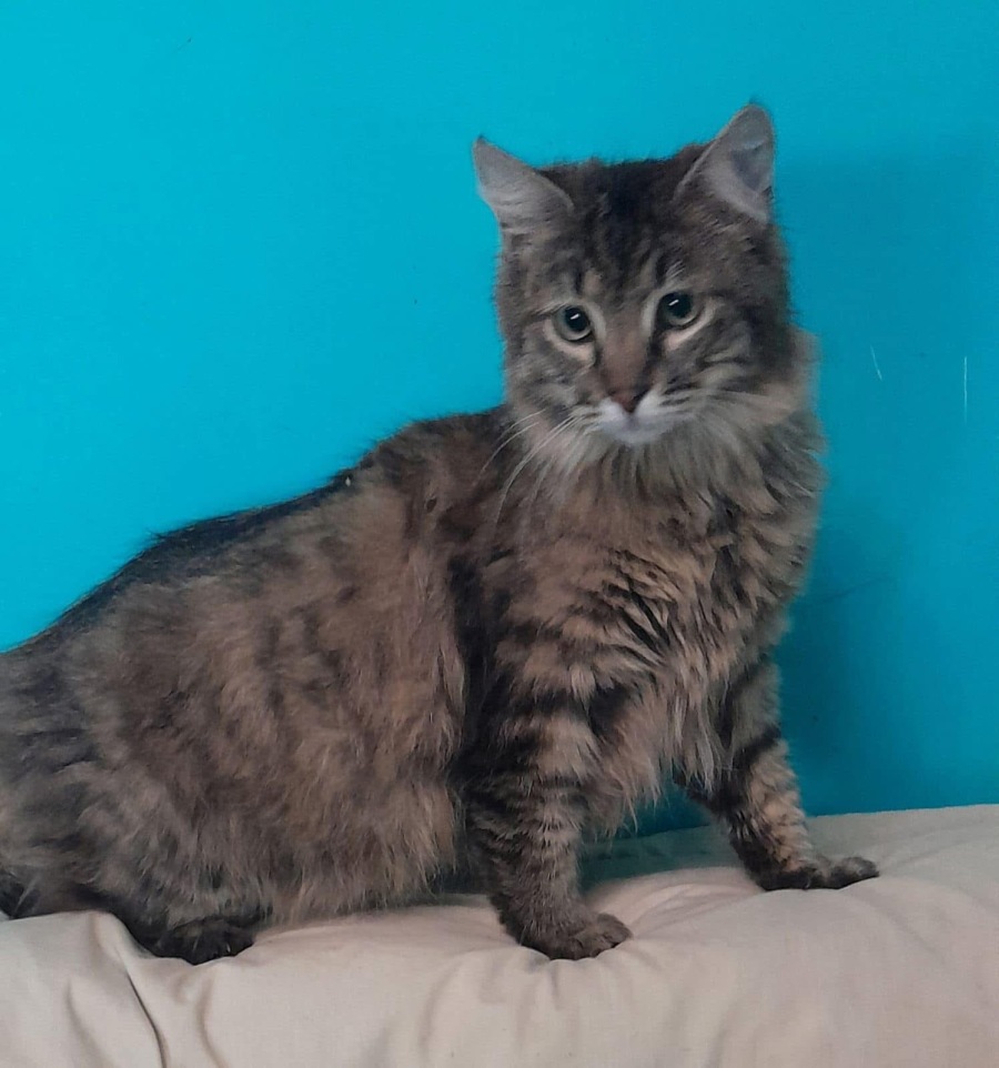 Jazzy is a very pretty with her long coat and tabby pattern.