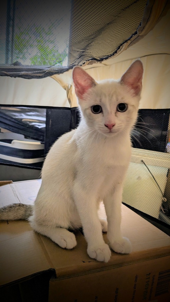 Moonlight is a gorgeous male kitten with a beautiful white coat and seal point-like tabby markings on his tail. He is part of a litter of 4 playful, affectionate kittens and is ready to bring joy and cuddles to his forever home!