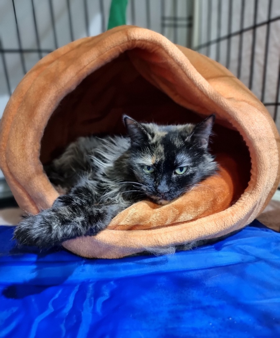 I am a shy senior lady ready for someone to be patient and kind to ensure I settle into my new home. I like to keep to myself, but I don't mind a head pat when I'm ready for it, and I'll let you know how much I enjoy them with a few purrs.