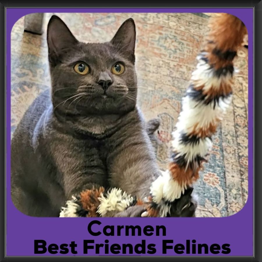 Carmen came into care from a pound and almost instantly made herself at home with her foster carer. She is super smoochy, handing out nose bops and head buts and loves making biscuits on your lap. She loves nothing more than to curl up across her carers lap, neck, arm – if there is a place that she can lie on you, she will find it. She is a huge purrer and also uses her voice to tell you that she wants attention. Her grey coat as the most beautiful pattern across it and she has the most exquisite little face and eyes that pierce your heart and commands attention.