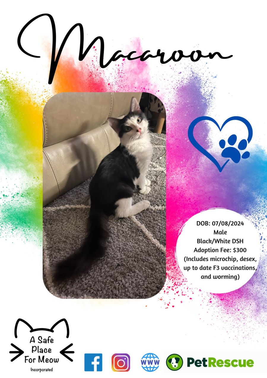Macaroon would be the purrfect addition to a loving home where he can share his affectionate nature and bask in the company of his human friends. Whether you’re seeking a cat to enjoy a Netflix marathon or a furry companion for quiet moments, Macaroon is more than ready to charm his way into your heart and home.