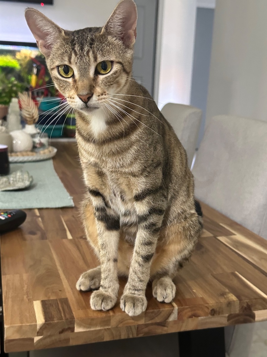I’m not your typical domestic short hair—I have striking features that resemble an Abyssinian or Egyptian Mau, though my exact heritage is a mystery. What I can say for sure is that I’m a total lovebug who adores human company.