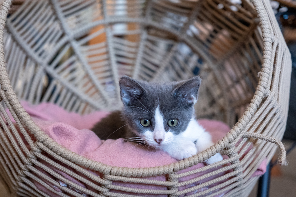 Miss Kiki is a very sweet, curious and beautiful little kitten. She has the cutest grey and white coat that is just so, so soft and perfect for cuddles and pats.