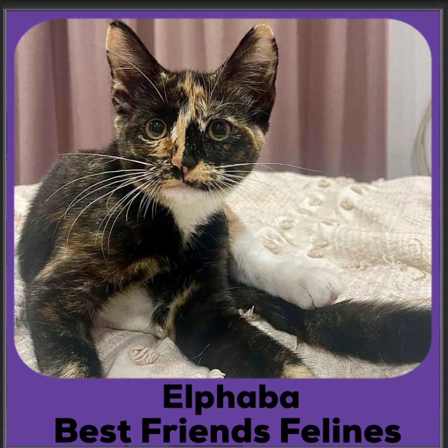 Elphie is a gorgeous Tortie calico with striking white socks. She joined the BFF family after being found abandoned with her sister, Glinda. Elphie has settled well in to foster care, and is a typical playful little kitten! She also has quite the set of lungs, and is more than happy to let you know when she’s ready for dinner or wants your attention. Though too busy playing to enjoy lots of snuggles, she turns on the purrs as soon as she’s picked up and will happily enjoy some pats from Mum. Elphie is looking for a family that will earn her trust, play lots of games and give her lots of attention!