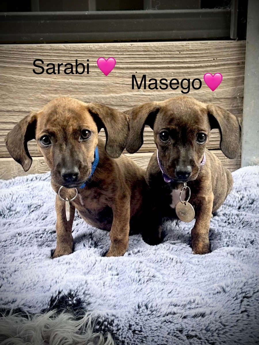 Hi I we are Sarabi and Masego, the perfect compromise when hubby wants a Staffy and wife wants a Dachshund ! We are little bundles of energy, always ready to play and explore our surroundings. In typical Dachshund style we loves to sit on your lap, have a good old bark at everything and are very nosy about what is going on around us!