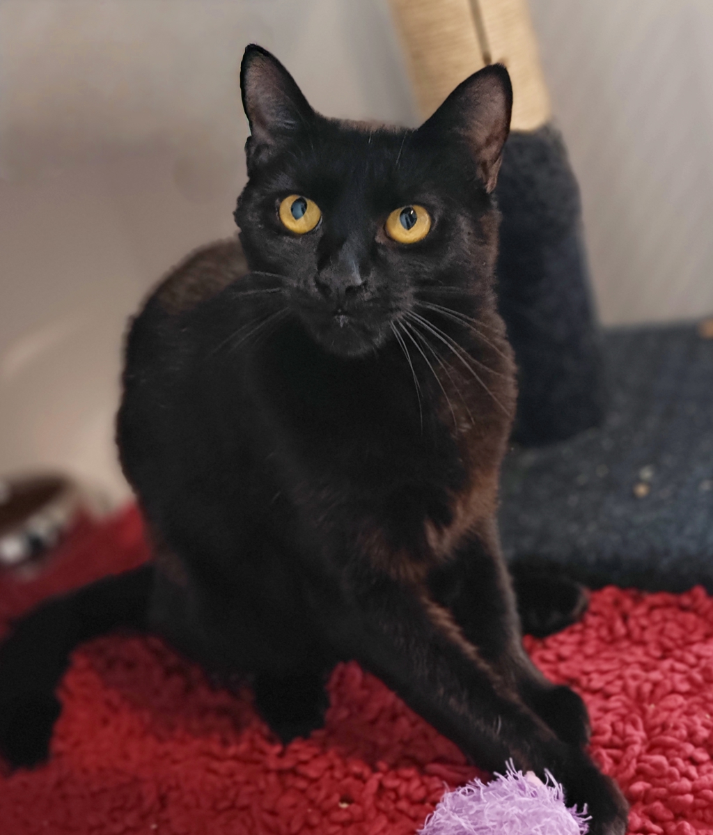 Meet Evelyn, a beautiful black female cat who recently finished raising her litter of kittens. Evelyn is a sassy and independent lady who knows her own mind. She may be a bit reserved at first, but once she gains your trust, she will shower you with love and affection. With a little patience and understanding, Evelyn will make a loyal and loving companion.