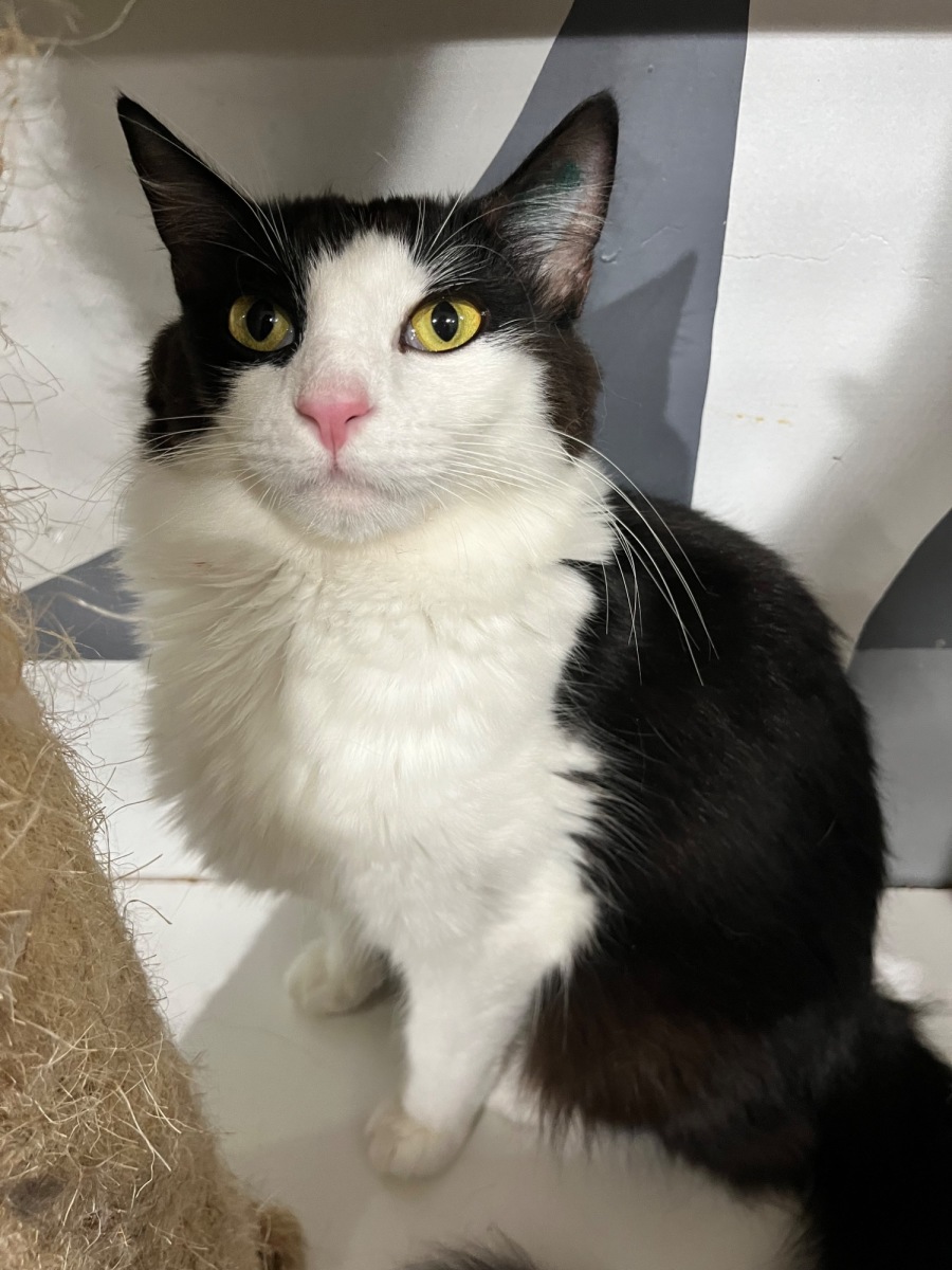 I'm a sweet lady who enjoys her food. I can be quite talkative at breakfast time, and I will let you know how hungry I am. I can be quite smoochy, I enjoy a few head rubs, therefore I would enjoy a house where I can curl up and chill with you. I would suit a house with other quieter cats but would also be happy by myself.